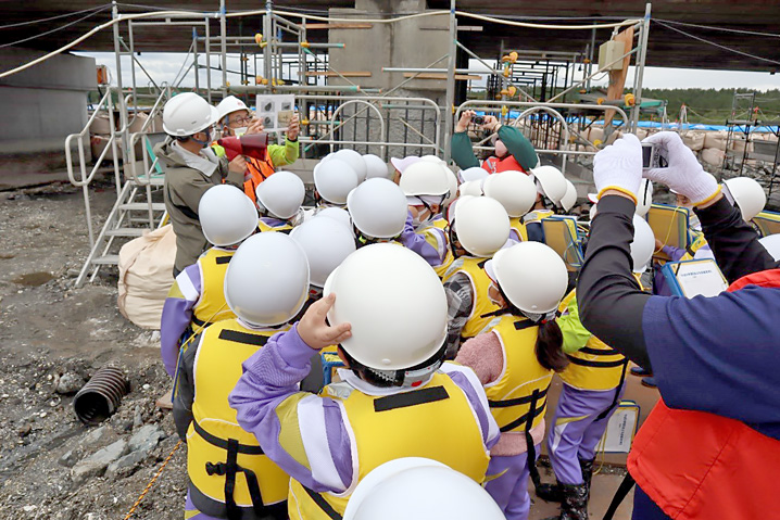 地元小学生の尾駮沼の沼底見学会 2022年10月6日(木)国道338号橋梁補修(尾駮橋)工事の現場において「六…