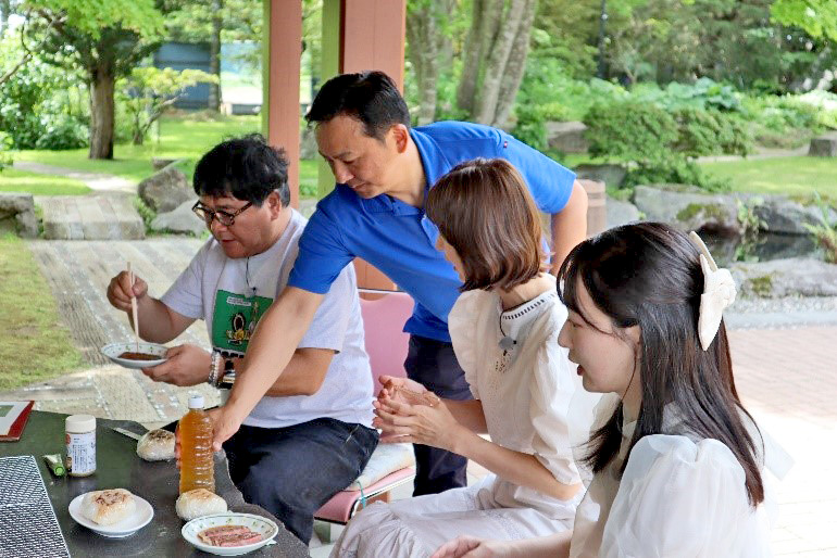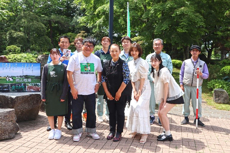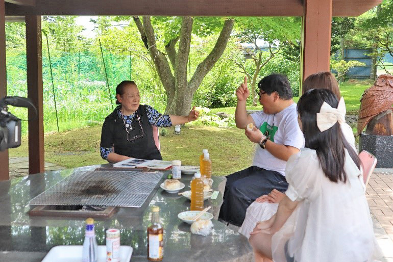 6月6日、お笑い芸人のカンニング竹山さん、元AKB48の篠田麻里子さん、ファッションモデルの越智ゆらのさんの3人が出演している「家族会議型バラエティ竹山家のお茶の間で団らん」という番組の取材を当社岡山せつ取締役が受けました。岡山牧場で育てた「小川原湖牛」に舌づつみをうちながら、原子燃料サイクル施設の立地前と後の六ヶ所村の暮らしぶりなどの質問で自分の感じたことや体験などを中心に説明しました。カンニング竹山さんとのトークを楽しんでいるようで、わかりやすく身振り手振りをまじえながら約1時間のインタビューを終えました。