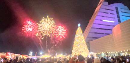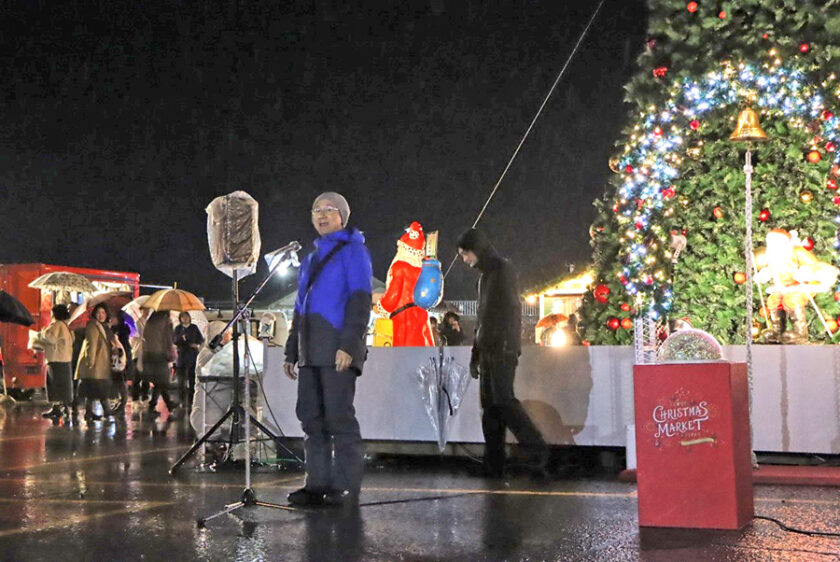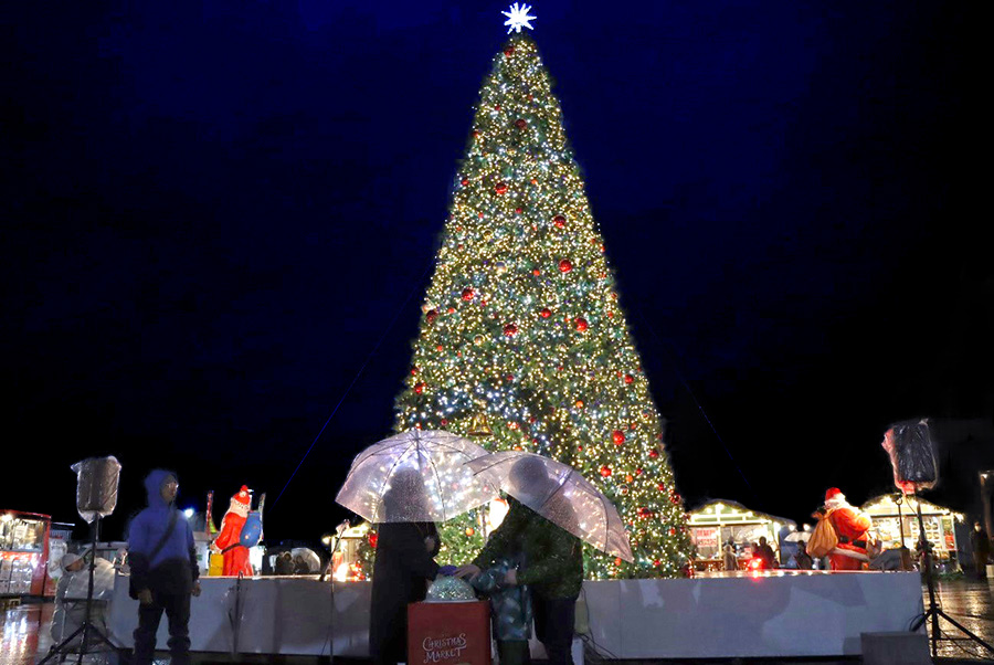 12月16日は、青森風力開発㈱が担当し、同イベントのシンボルである高さ10mの大型クリスマスツリーの点灯式を行いました。点灯式は、16:00、16:30、17:00、17:30、18:00、18:30、19:00 県内在住9組のご家族に参加いただきました。あいにく天気は雨模様でしたが、大きな声で元気いっぱいに「メリークリスマス!」と自分の顔程の大きなスイッチを押してくれました。今年は多数の参加者となり30分ごとの点灯式でした。