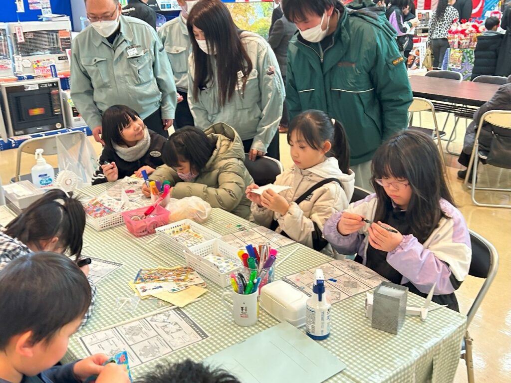 当社として、本イベントへの参加は初めてです。当社ブースでは、地域の皆様に風力発電事業についての理解を深めていただくと共に、㈱岡山建設が進めている「大間奥戸風力発電事業」の取り組みを知ってもらう事を目的として、「風車(ふうしゃ)をつくろう」と題したかざぐるまの手作り教室を開催しました。当日の会場には802名の方々がご来場し、当社ブースには48名の子供たちが立ち寄り、個性豊かなオリジナルのかざぐるまを作成していただきました。