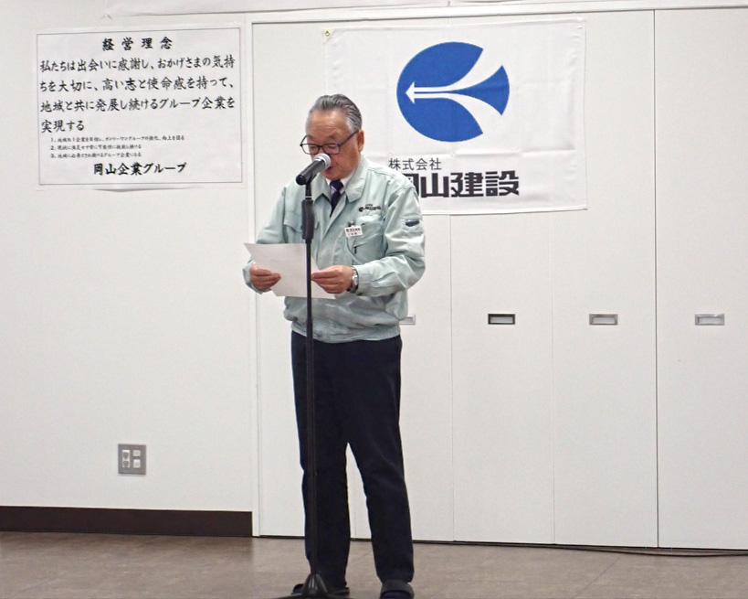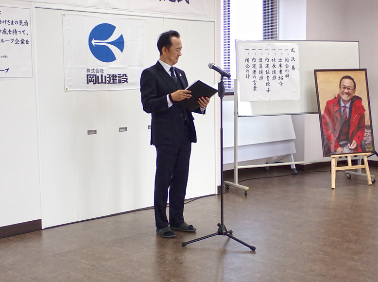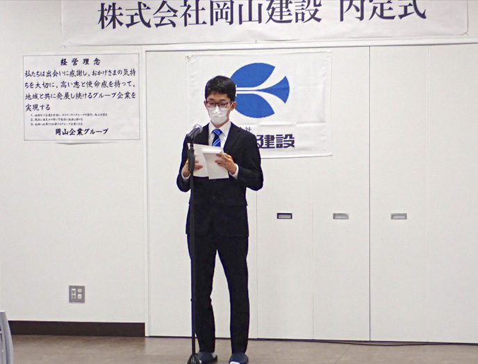 内定式には、内定者とそのご家族も参加し、来年4月入社の内定証書授与を行い、新しく岡山建設へ仲間入りすることを誓いました。内定式後の懇談会では、岡山社長、役員、部門長と会話を交わしながら昼食をとり、和やかな親睦の場となりました。