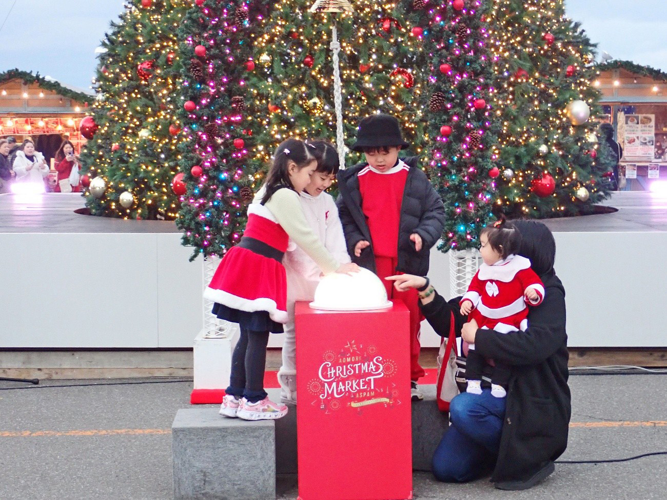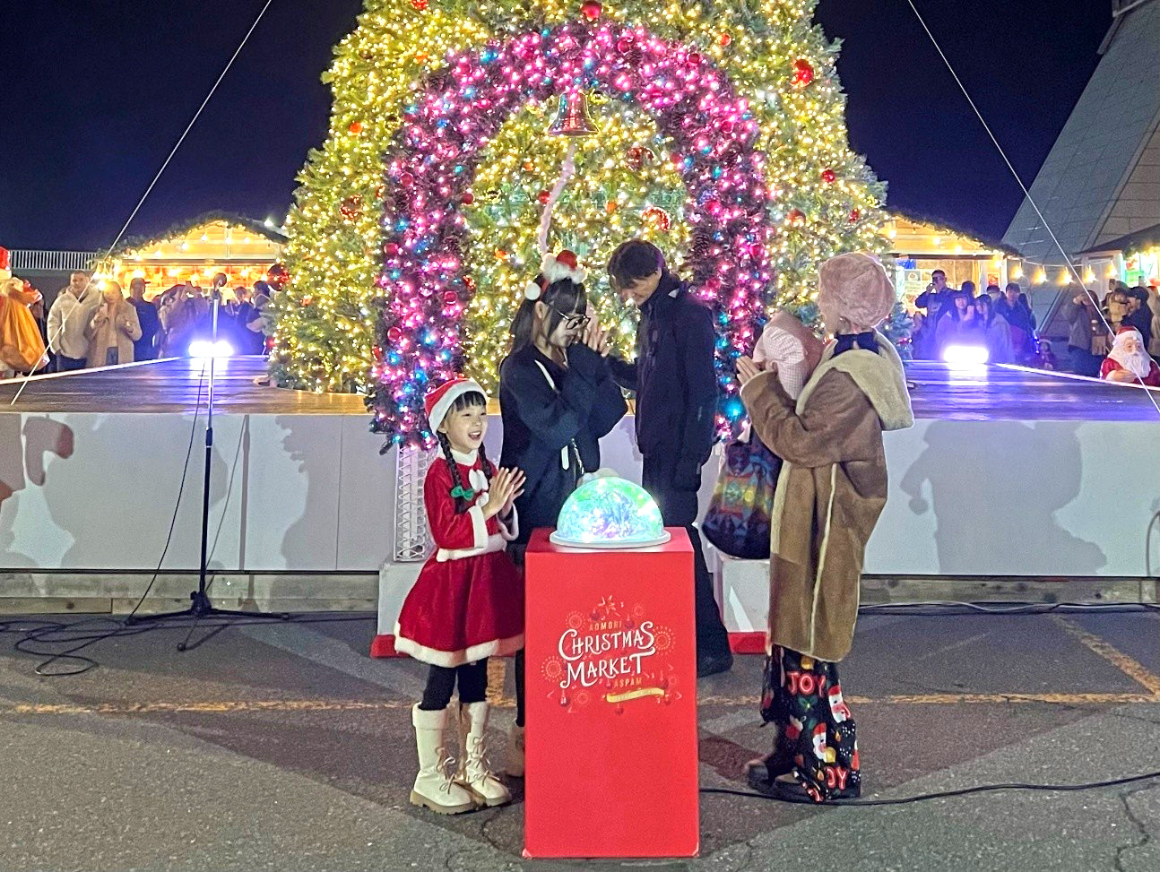 12月20日(土)は、シンボルである高さ10mの大型クリスマスツリーの点灯式を行いました。点灯式は、16:00、17:00、18:00、19:00に行い6組のご家族に参加いただきました。今年は天候にも恵まれ、クリスマス衣装に身を包んだご家族が参加してくださいました。元気いっぱいの大きな声で「メリークリスマス!」と声をそろえながら、大きな点灯スイッチを押してくれました。