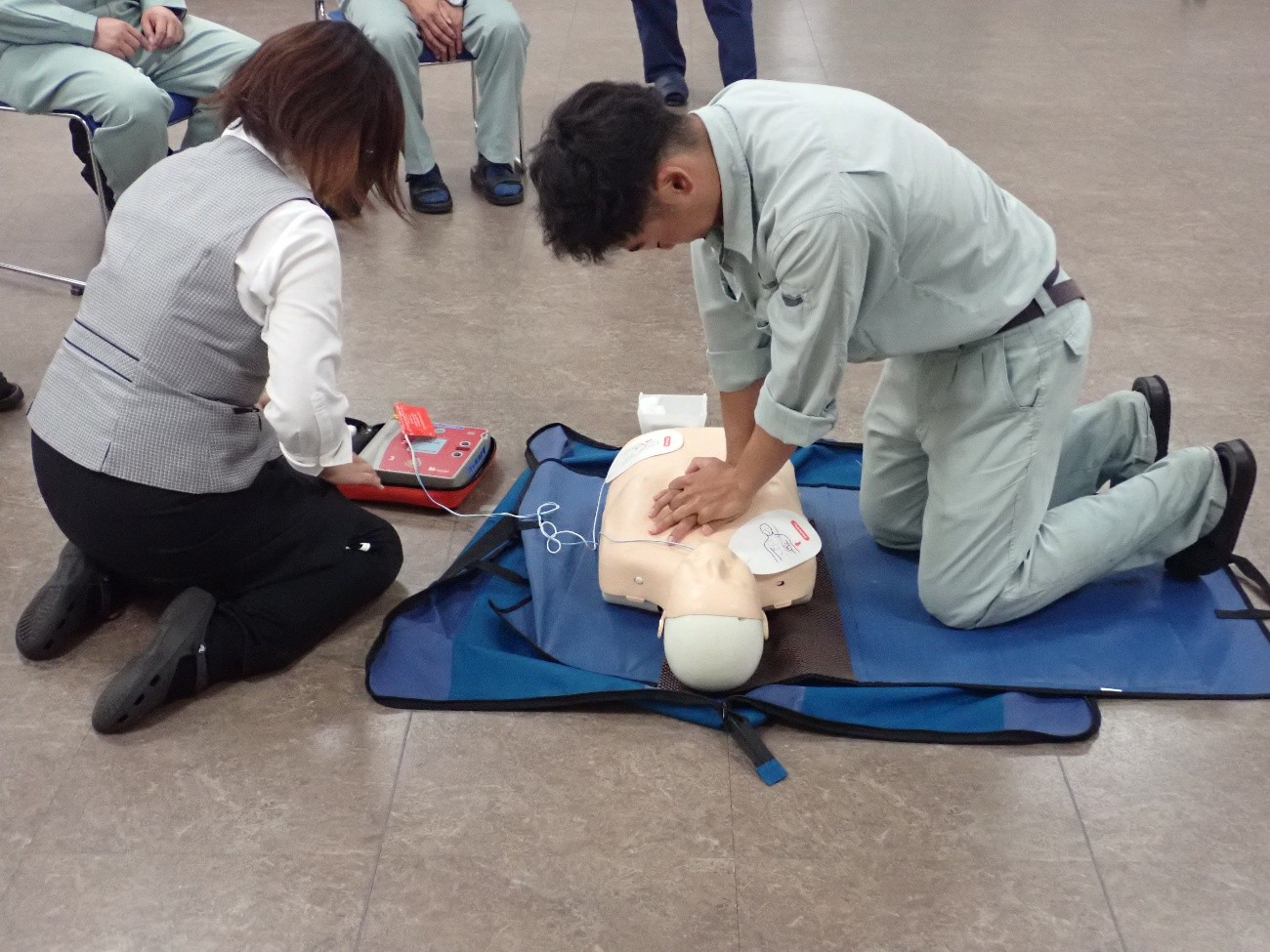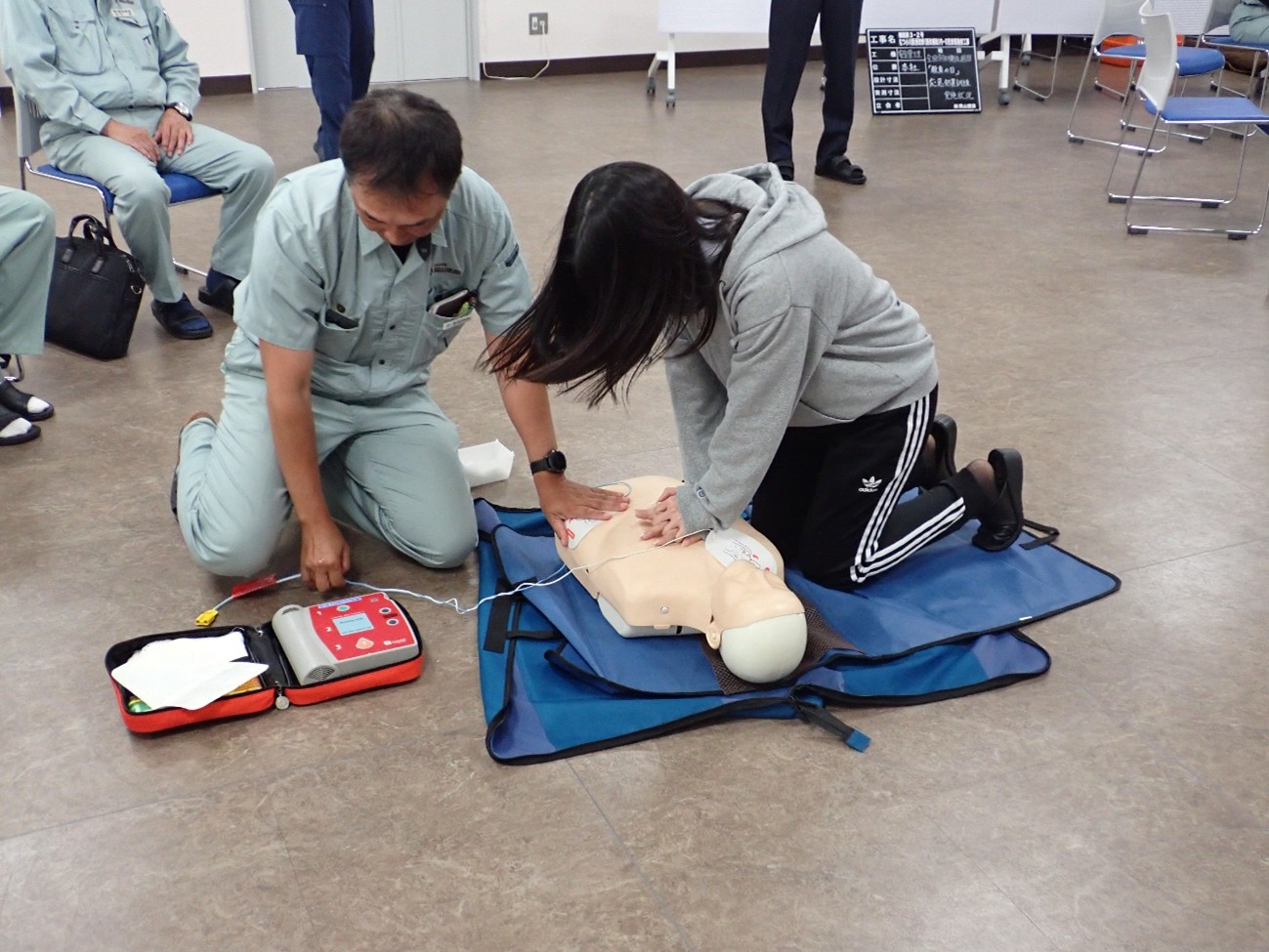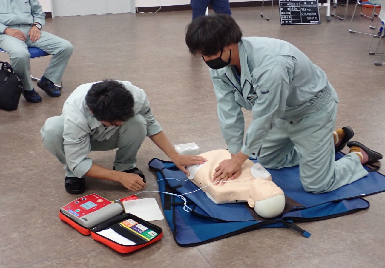 10月3日に労働衛生週間の一環として六ヶ所村消防署から救急隊員の方を招き応急処置講習を行いました。DVDでAED(自動体外式除細動器)使用の重要性と有用性を学び、実際に訓練用人形にAEDを使用し、心臓マッサージとAEDの使用手順を学びました。