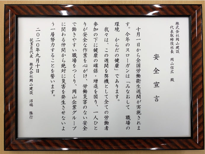 従業員の安全意識向上を目的とし、岡山企業グループ(7社)と岡山建設安全推進協議会の共催で新型コロナウイルス感染対策の下、 「2020年岡山企業グループ安全大会」を六ヶ所村交流プラザ「スワニー」において開催いたしました。