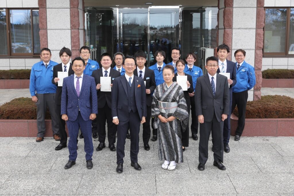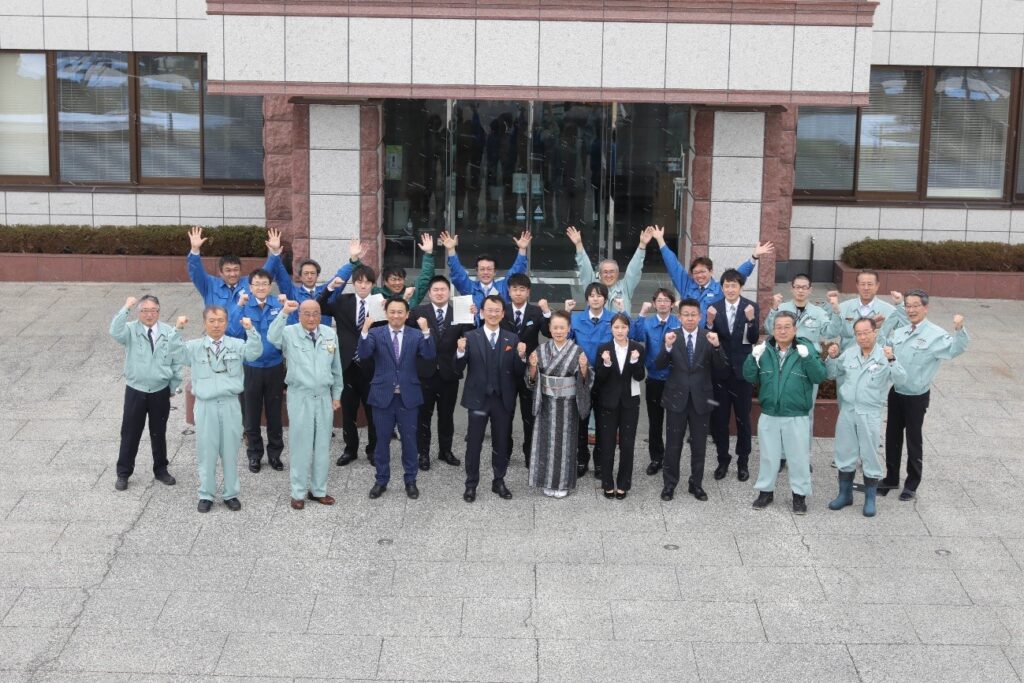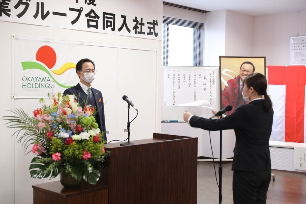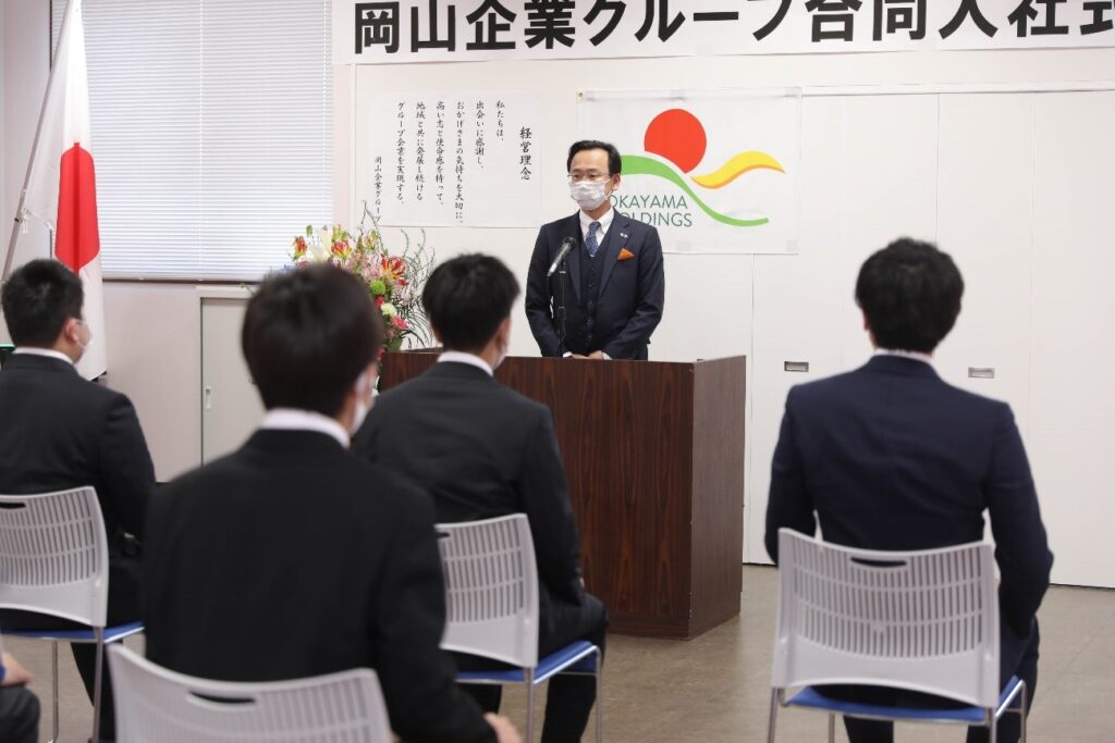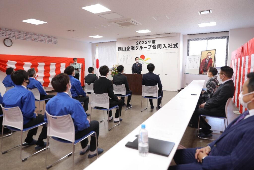 2022年4月1日、岡山企業グループ合同入社式を岡山建設において、岡山信広同グループ代表企業㈱岡山建設代表取締役社長はじめ構成企業代表者等の出席のもとで実施しました。