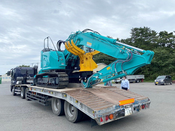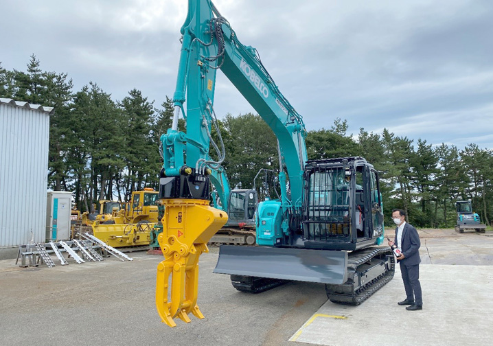 2022年8月20日、バックホウ(0.45㎥級)が納車されました。バックホウは建設重機の一つで、ショベル(バケット)をオペレータ側向きに取り付けたもので、オペレータの方に引き寄せる方向に操作します。今回は、作業装置の部分(アタッチメント)に全回転フォークグラップルを取り付けて納車しました。このアタッチメントにすることで、建物などの解体などにも使うことができます。