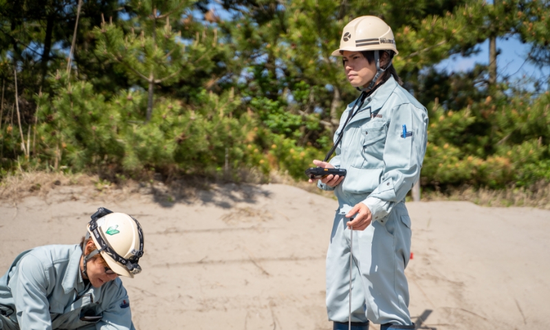 現場での測量(高低差、角度、距離、地形)も担当しています。