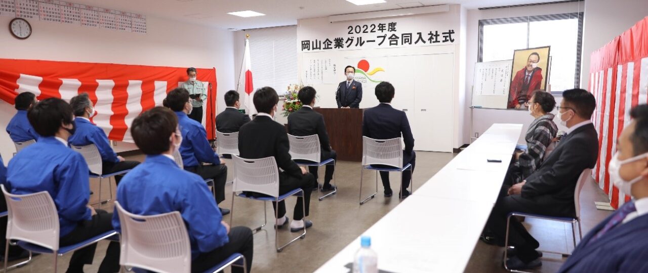 2022年4月1日、岡山企業グループ合同入社式を岡山建設において、岡山信広同グループ代表企業㈱岡山建設代表取締…