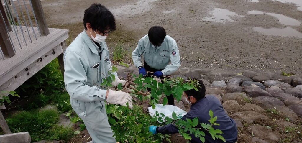 六ヶ所村商工会加盟関係者約160名が参加して、尾駮レイクサイドパーク及び尾駮川川べり周辺の清掃作業を行いました。当社からは、昨年から今年に入社したニューフェイスを中心とした5名の従業員が参加して、港構内及び周辺道路の空き缶、空きペットボトル、たばこの吸い殻等の拾い集めや河川敷の草刈りを行いました。