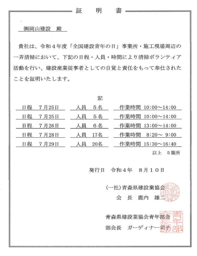 (一社)青森県建設業協会の青年部会が提唱している「全国建設青年の日」事業所・施設現場周辺の一斉清掃活動に賛同し、当社が受注し施工管理している現場周辺の清掃ボランティア活動を行いました。